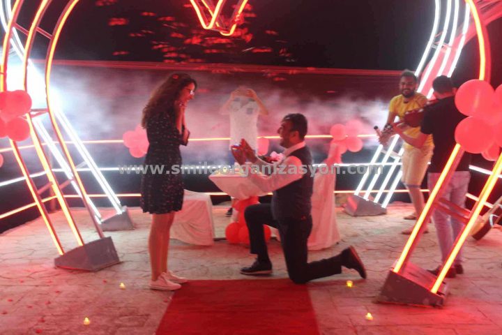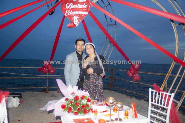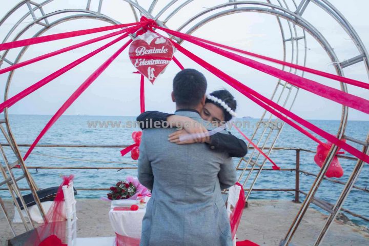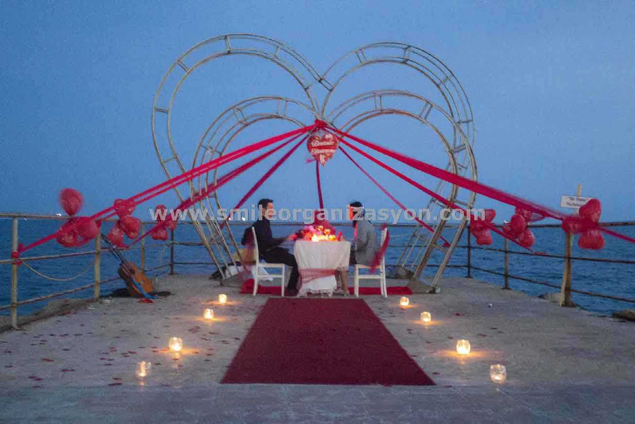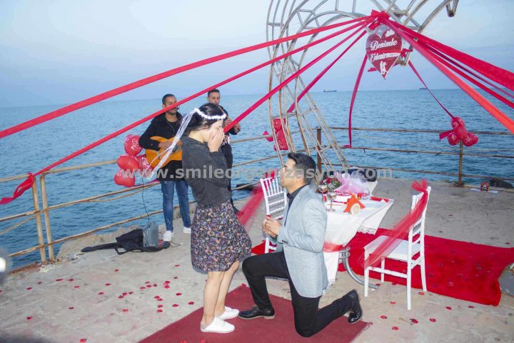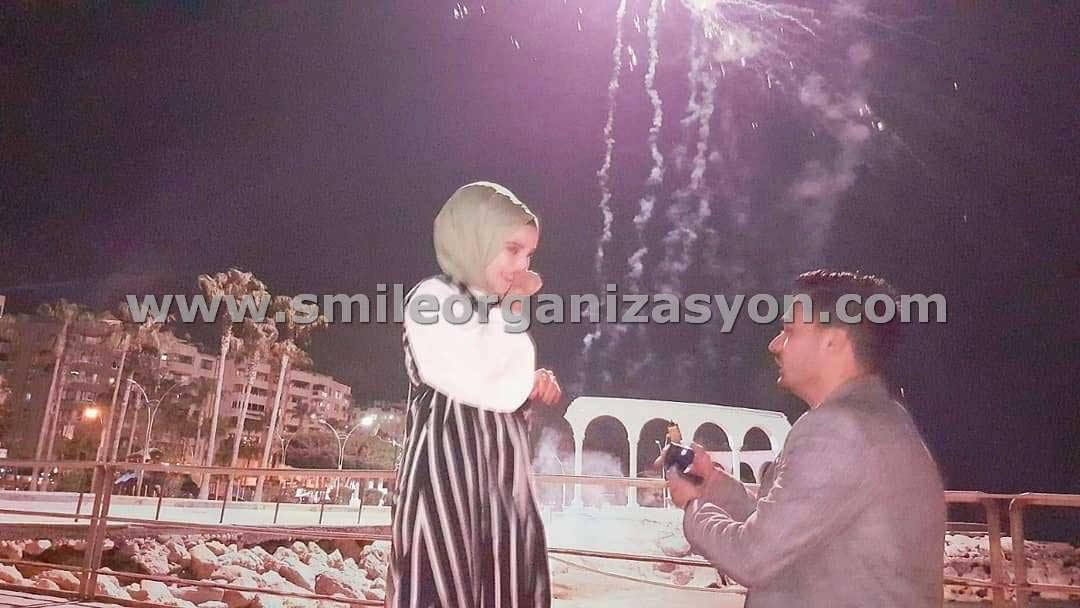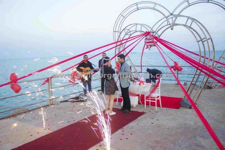 Sizinle bir saat belirliyoruz. Örnek: 6-7 , 7-8 , 8-9 vb. Ardından kız arkadaşınızla yemek yemek yada bir şeyler içmek bahanesi ile mersin muğdat sahilinde sürekli yaptığımız iskeleye doğru kız arkadaşınızı getiriyorsunuzz.İskeleye geldiğiniz an organizasyon başlıyor. Volkanlar yanmaya başlıyor meşaleler yanıyor. Canlı müzik devreye giriyor. Video kaydı alınıyor ve profesyonel fotoğraf çekimi eşliğinde teklifinizi gerçekleştiriyorsunuz.